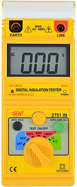 ● Timer for test function (count 3-5 minutes). ● Three insulation test voltages(DC V) : 250V, 500V, 1000V. ● 3½ digital LCD (2000 counts). ● 68 × 34mm (2.677” × 1.338”) large LCD display. ● Automatic circuit discharge. ● Test insulation at rated voltage into a 1mA load. ● 200mA short circuit testing current for continuity. ● External voltage warning indication. ● Fuse protection. ● Data hold function ● Auto power off function. ● BS 16 edition.